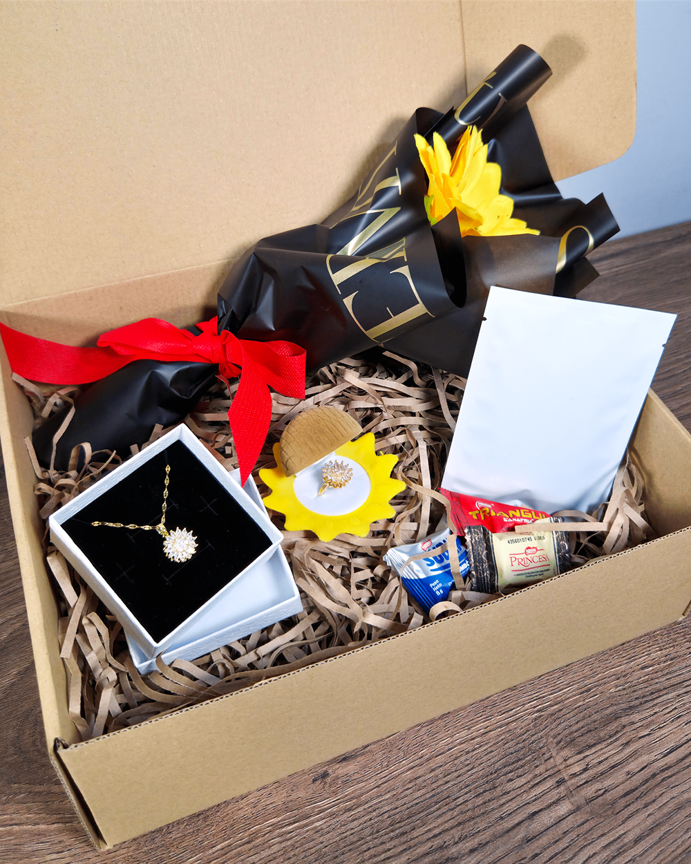 Este set de regalo incluye un elegante collar, pulsera, anillo y aretes con un diseño giratorio de girasoles. Conviértete en el centro de atención con este completo set y agrega un toque de elegancia a tu estilo. Hecho con detalles de alta calidad y perfectamente diseñado para ti.